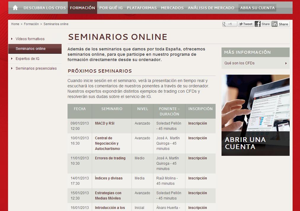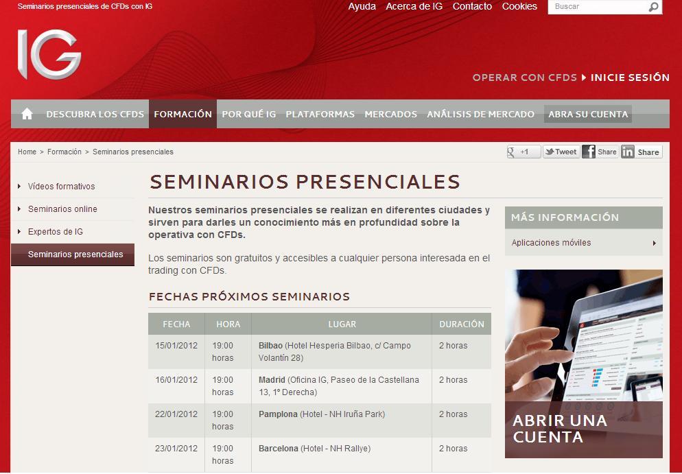 Molts de vosaltres ja coneixereu els avantatges d'invertir amb Contractes per Diferències (CFD), per a aquells que àdhuc no sapigueu com invertir amb aquest tipus de contractes, us portem els cursos d'IG.Amb l'objectiu de donar a conèixer les inversions a través de Contractes per Diferències, IG engegarà durant el mes de gener varis cursos presencials a Bilbao, Madrid, Pamplona, Barcelona i la Corunya, que us respondran a tots els dubtes que podeu tenir sobre aquesta manera d'inversió. La finalitat principal d'aquests cursos és introduir-nos en les operatives dels mercats financers mitjançant aquests productes derivats, els quals cobren dia a dia una major popularitat en l'estat espanyol. Durant les dues hores que dura el seminari, es tractaran els aspectes principals dels CFDs: què són, quins són les seves característiques i què els diferencia d'altres derivats; acabant amb una petita introducció a la plataforma d'operacions d'IG perquè puguem veure com posar una ordre i operar amb un compte de CFDs. Qui imparteix els cursos presencialsEls cursos presencials seran impartits pels estrategues de mercat d'IG: Soledad Pellón i Daniel Pingarrón. Tots dos professionals compten amb una àmplia experiència als mercats financers, més concretament en les operatives amb CFDs. Sent a més col·laboradors habituals en els diferents mitjans de comunicació econòmics i financers espanyols, consultats diàriament sobre la seva visió dels mercats. |